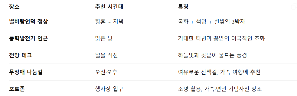 낮에는 꽃밭과 풍력발전기 아래 걷는 힐링 산책, 밤에는 별과 불빛이 어우러진 로맨틱 공연을 즐길 수 있습니다.