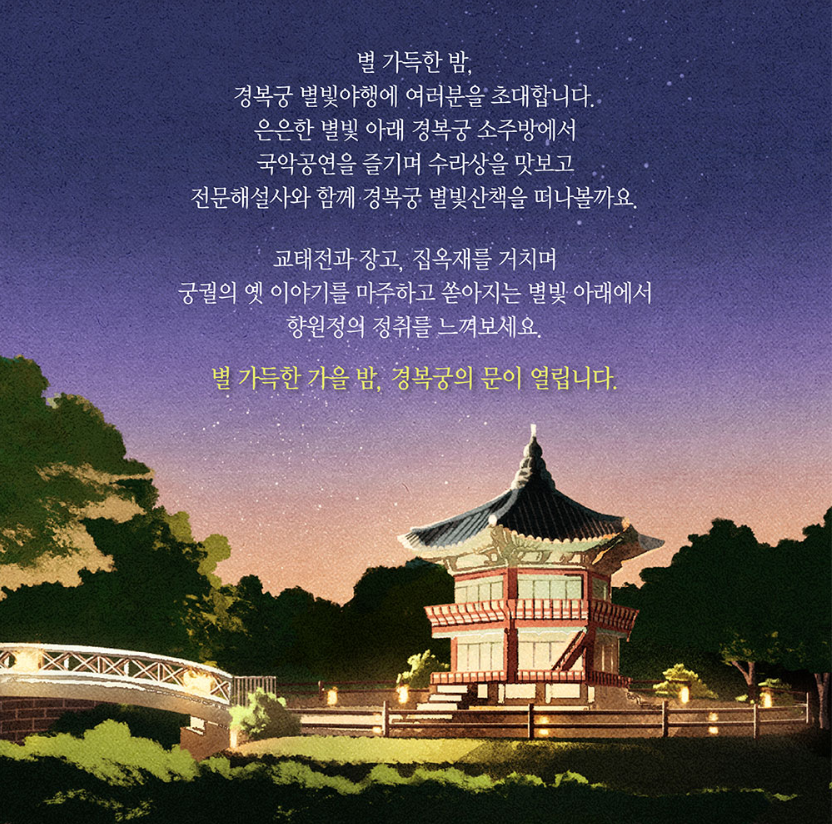 2025년 하반기 경복궁 별빛야행은 궁중 음식 체험 + 역사 해설 + 전통 공연 + 야경 산책이 결합된 프리미엄 문화 프로그램입니다.