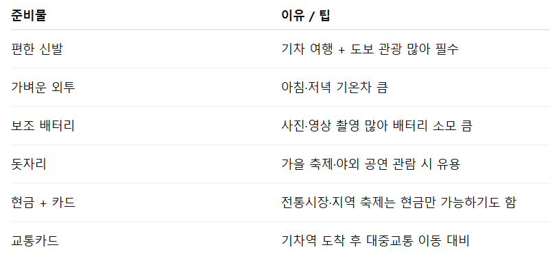 - 문화행사 확인: 가을 축제(불꽃축제, 단풍축제, 국화축제 등) 일정과 맞추면 여행 만족도 배가