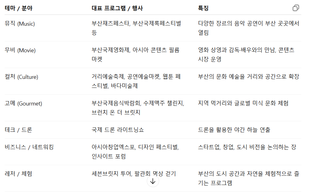 이 축제는 공연 예술부터 영화, 음악, 불꽃, 지역 전통문화까지 아우르며 부산 시민은 물론 전 세계 관광객을 끌어들이는 글로벌 축제로 발전하고 있습니다.