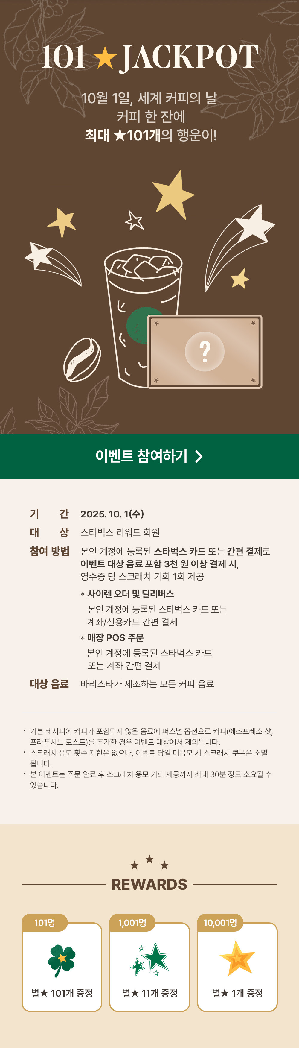 세계 커피의 날, 스타벅스가 가장 먼저 내세운 핵심 이벤트는 바로 ‘101★JACKPOT’입니다.