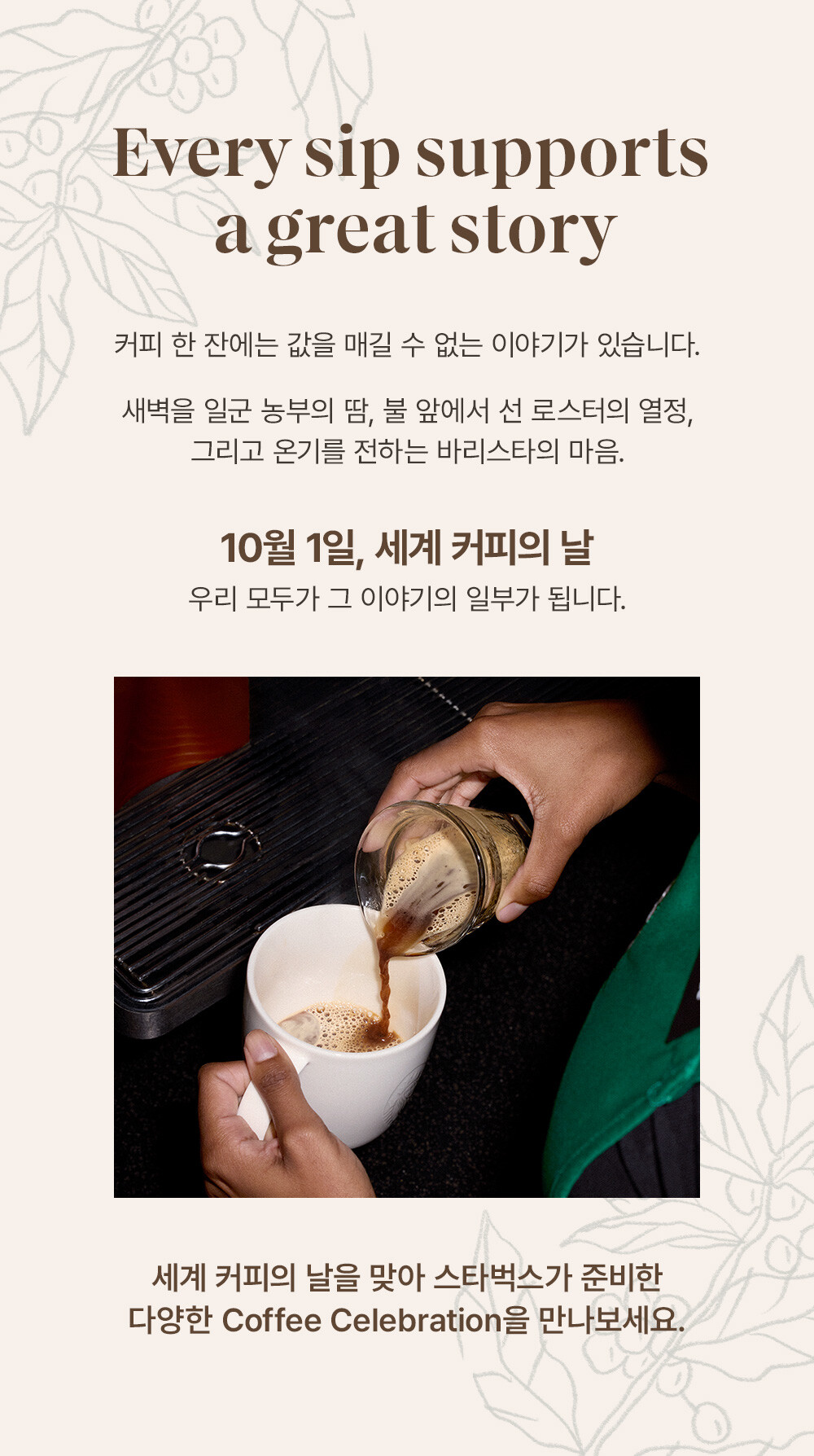 10월 1일은 전 세계적으로 커피의 가치를 기념하는 세계 커피의 날입니다. 스타벅스 코리아는 이 날을 맞아 전국 매장과 온라인 앱 스토어에서 풍성한 혜택을 담은 고객 감사 이벤트를 준비했습니다.