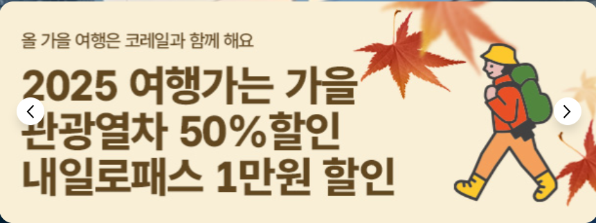 짧지만 강렬한 이 한마디 속에는, 코레일이 전하고자 하는 여행의 가치가 담겨 있습니다. 합리적인 가격, 편안한 이동, 그리고 가을의 낭만까지… 이번 기회에 모두 잡아보시길 추천드립니다.