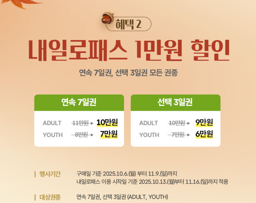 할인 혜택은 10월 13일부터 11월 16일까지 운영됩니다. 예매 일정은 상품에 따라 다르니 꼭 확인해두세요.