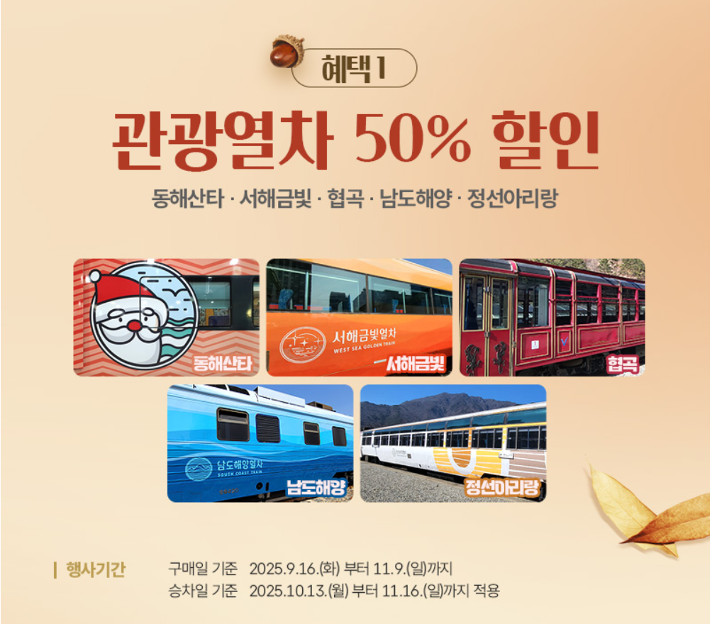이번 프로모션의 핵심은 관광열차 50% 할인 혜택입니다. 가을철 관광 수요가 높은 인기 노선 5개가 대상인데요.