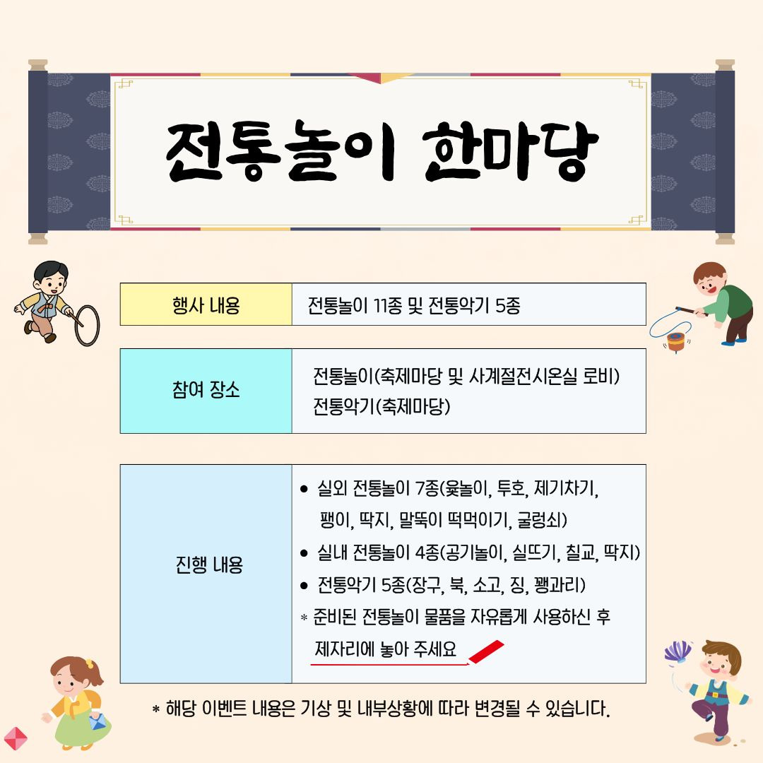 윷놀이, 제기차기, 공기놀이 등 11종의 전통놀이가 마련되어 가족 단위 방문객들이 세대 불문하고 함께 즐길 수 있습니다.