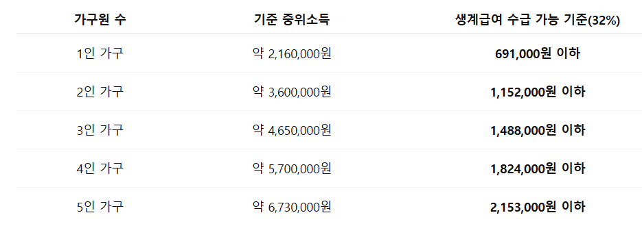 2025년 기준, 생계급여 수급 자격은 기준 중위소득의 32% 이하로 설정되어 있습니다.