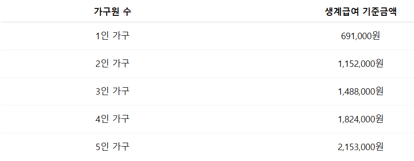 즉, 가구의 총 소득인정액이 위의 기준보다 낮아야 생계급여 수급이 가능합니다.