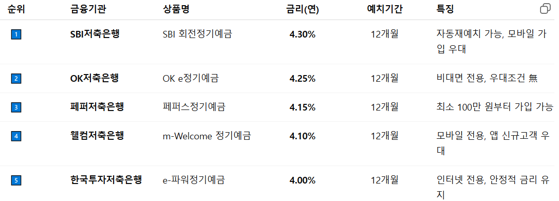 3. 정기예금 고금리 TOP 5 (2025년 10월 기준)