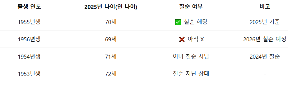 현재 연도 - 출생연도 = 연 나이 예시: 1955년생은→ 2025 - 1955 = 70세(연 나이)