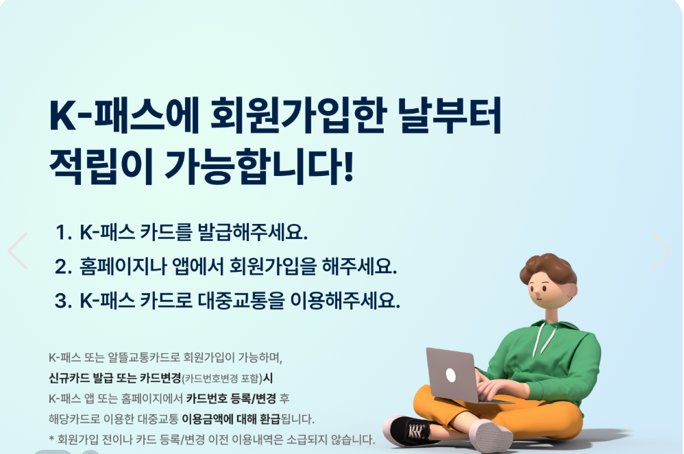 - 카드 수령 후 K-패스 전용 앱 또는 홈페이지에 회원가입을 하고 해당 카드를 등록합니다.